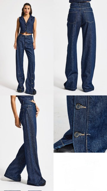 This two-piece set features a sleeveless structured vest with front button closure, paired with high-waisted wide-leg jeans that elongate the silhouette. The deep blue wash keeps it classic, while subtle side button details at the hem add a refined, unique touch.