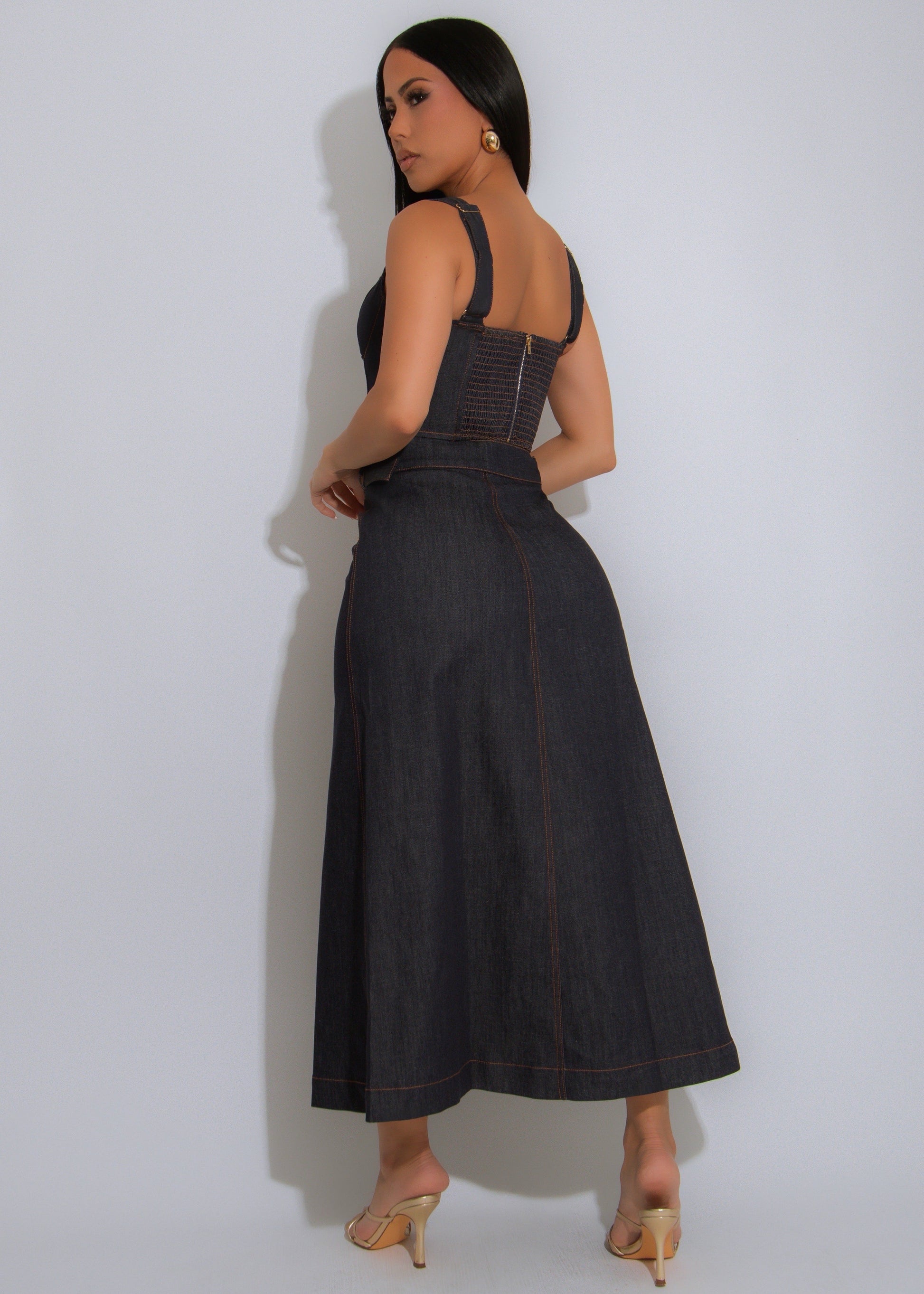 Denim reimagined with sophistication. This two-piece set features a structured corset-style top with boning for a flattering shape and a wrap midi skirt with an adjustable belt.Crafted from dark wash denim with contrast stitching, it enhances your figure with a feminine yet modern silhouette. Perfect to dress up with heels or style casually with sandals or boots.