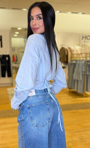 This structured button-down shirt features a sleek front tie detail and an adjustable back waist for a flattering fit. Designed in soft light blue and delicate blush pink, it blends timeless elegance with modern styling.