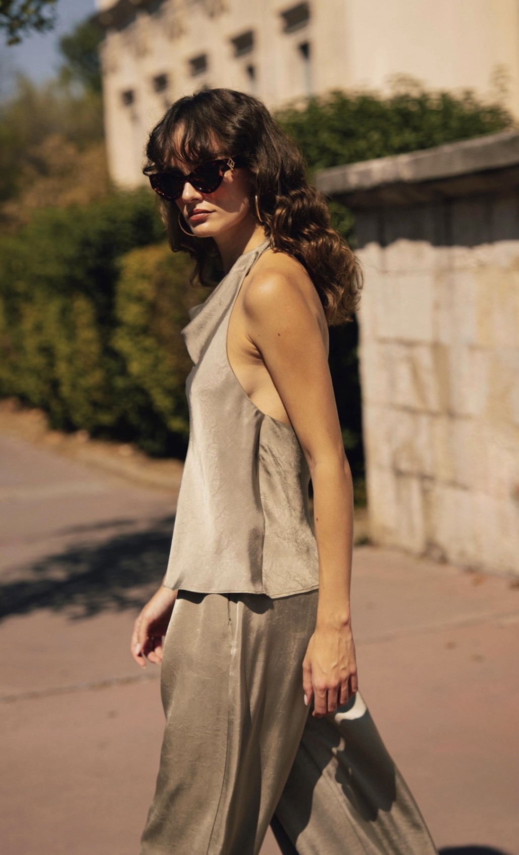 Satin two-piece set featuring a cowl-neck sleeveless top with an open back, paired with high-waisted wide-leg pants. Its fluid and elegant silhouette makes it perfect for special occasions or sophisticated looks with effortless comfort.